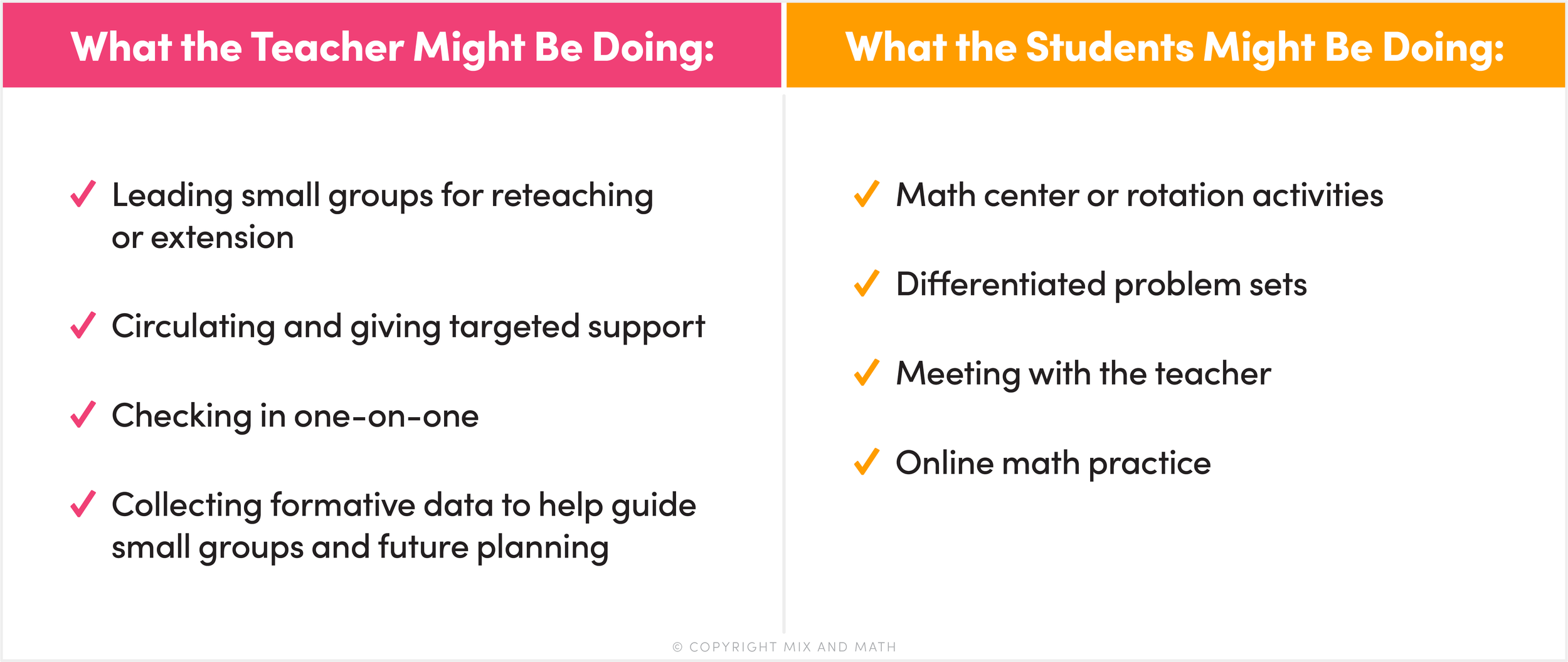 Students might work independently, with a partner, or in a group. The key during this time is that everyone is engaged in meaningful practice and getting what they need to grow.