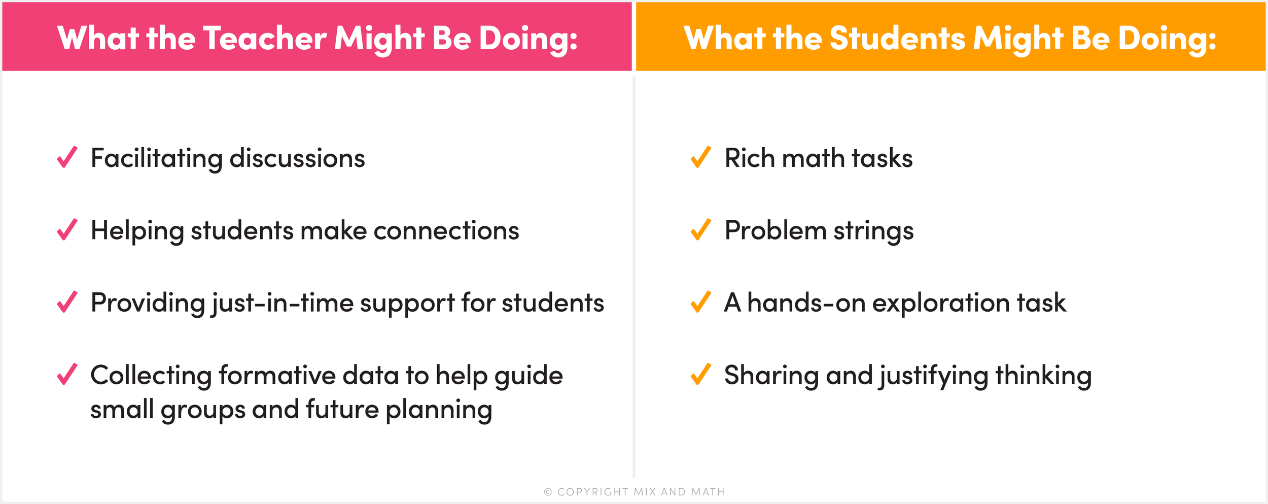 Now we’re getting into the heart of the block: the lesson. Students explore new ideas, test strategies, and make sense of important concepts while the teacher leads and facilitates.