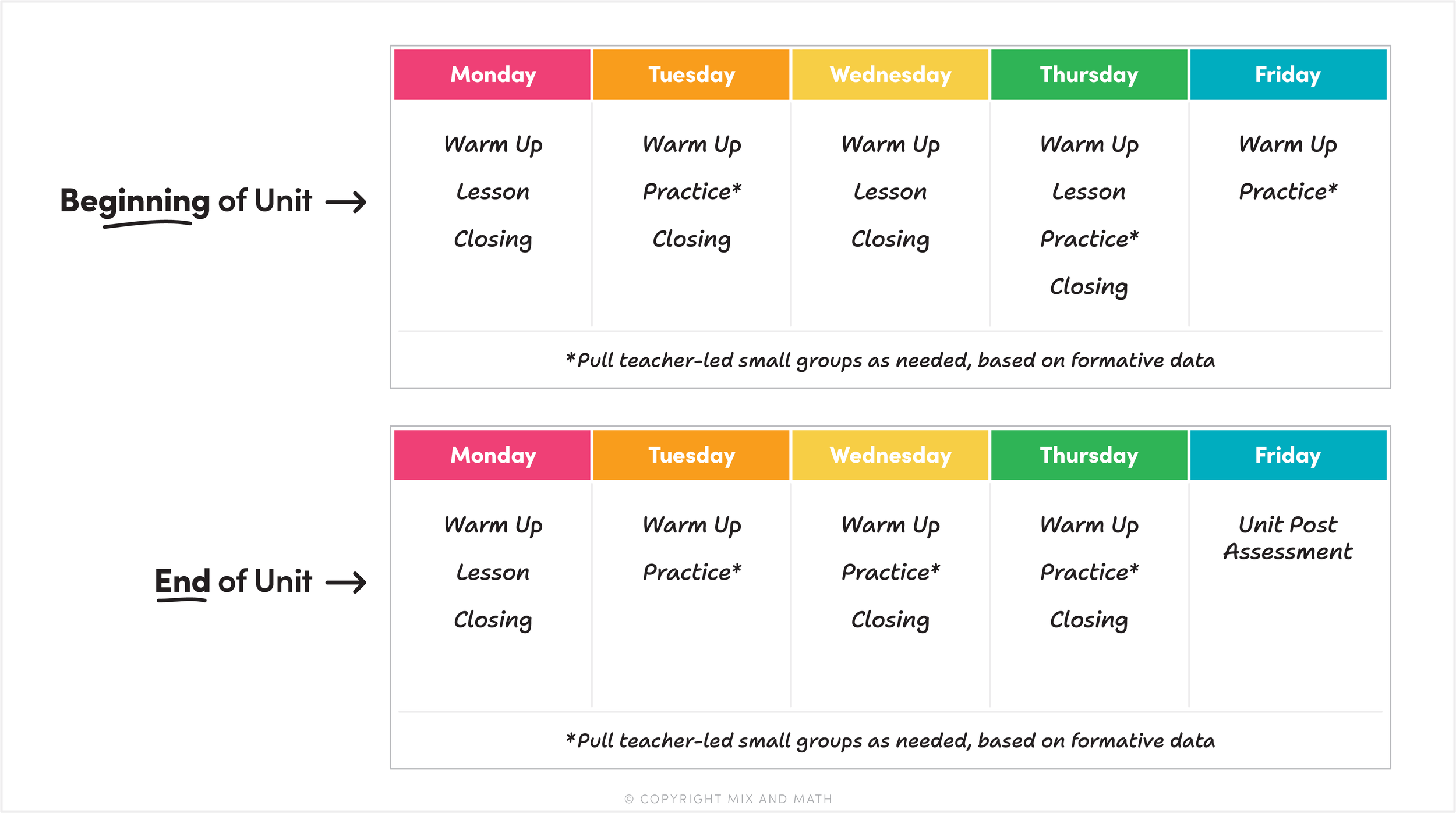 At the start of a unit, you might need more time for lessons to explore your new concepts. Towards the end, you might prioritize more practice time and small group instruction.