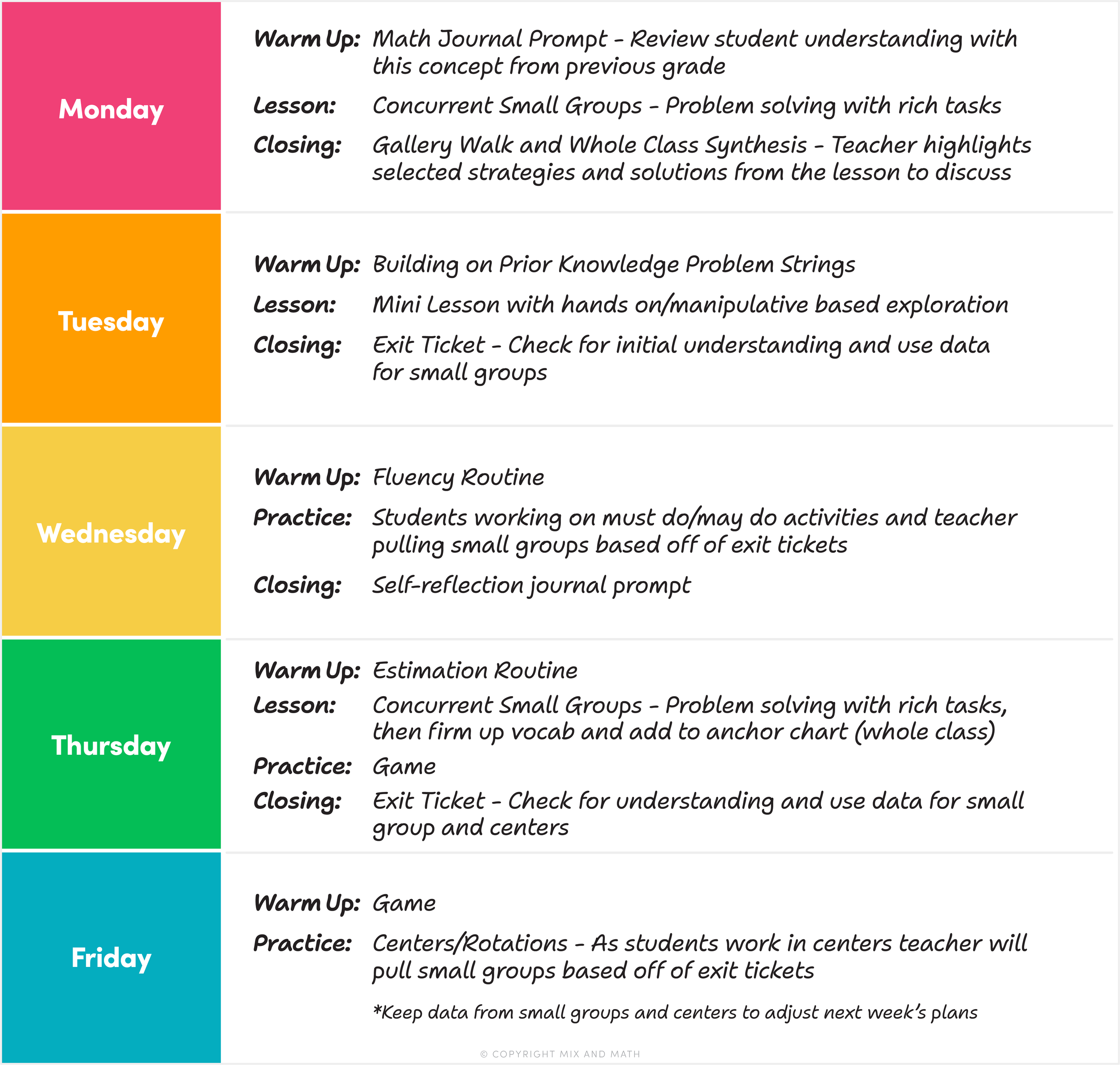 Sometimes your math block is shorter than you’d like, broken up by lunch or specials, or affected by a wonky schedule. In those cases, don’t try to squeeze everything in. Instead, zoom out and plan across the week. Think or plan in chunks.