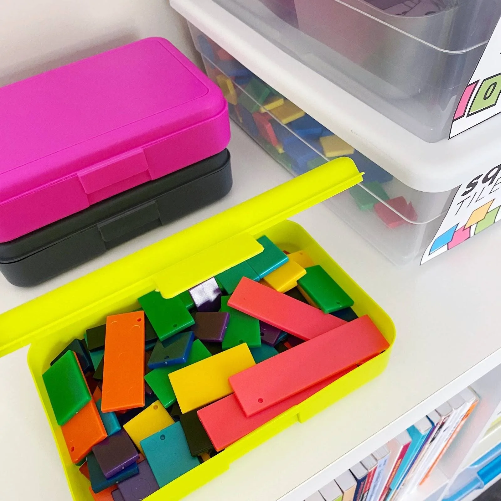 Find containers that stack easily and close securely. I don't particularly love containers where students have to sort each type of piece into different sections of the container because it takes extra time for students to sort during clean up. Dollar Tree, Target, and Amazon all have great options!