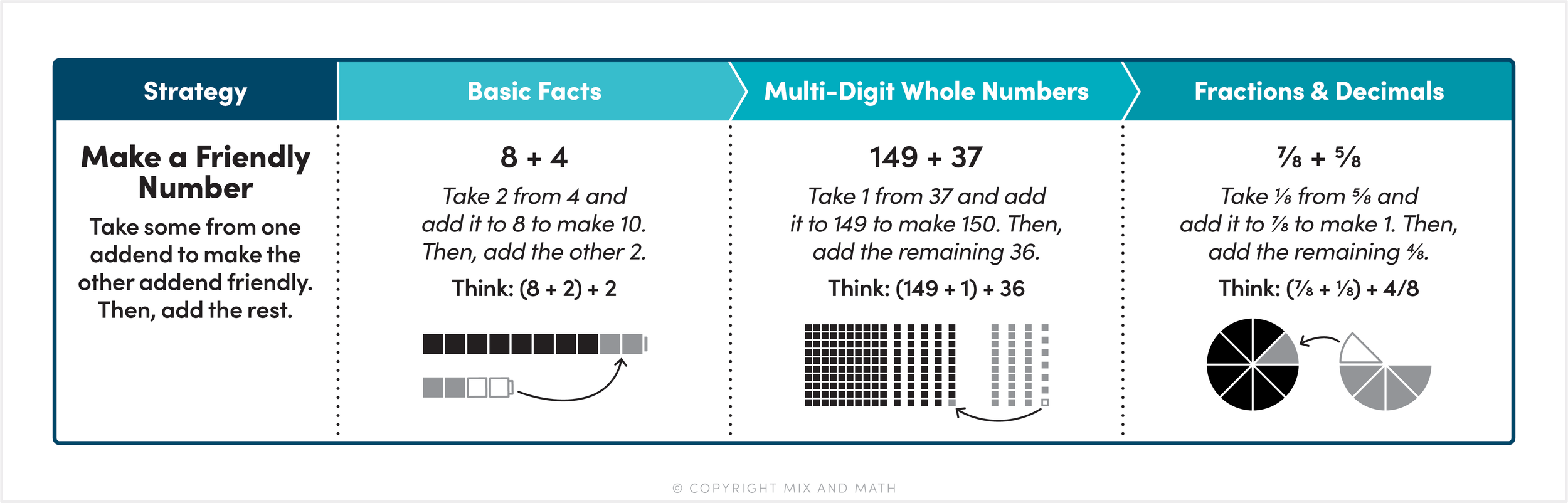 When students apply these strategies to multi-digit whole numbers, fractions, and decimals, math manipulatives and visual models continue to be a great support! The base ten blocks and fraction circles in the example above not only remind students of why the strategy works, but they also help students see when this strategy might be useful! When one addend in a problem is close to a friendly number, this strategy is a great option.