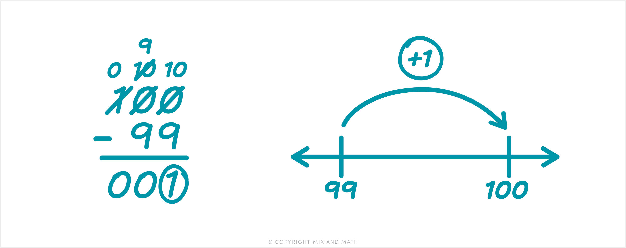 For example, consider the problem 100 - 99. A student who only knows the algorithm will stack the numbers, regroup across multiple zeroes, and follow a long series of steps to find the answer of 1. But a student who knows that “Add Up” is one of several subtraction strategies can immediately count up 1 in their head from 99 to 100 to get the answer of 1.